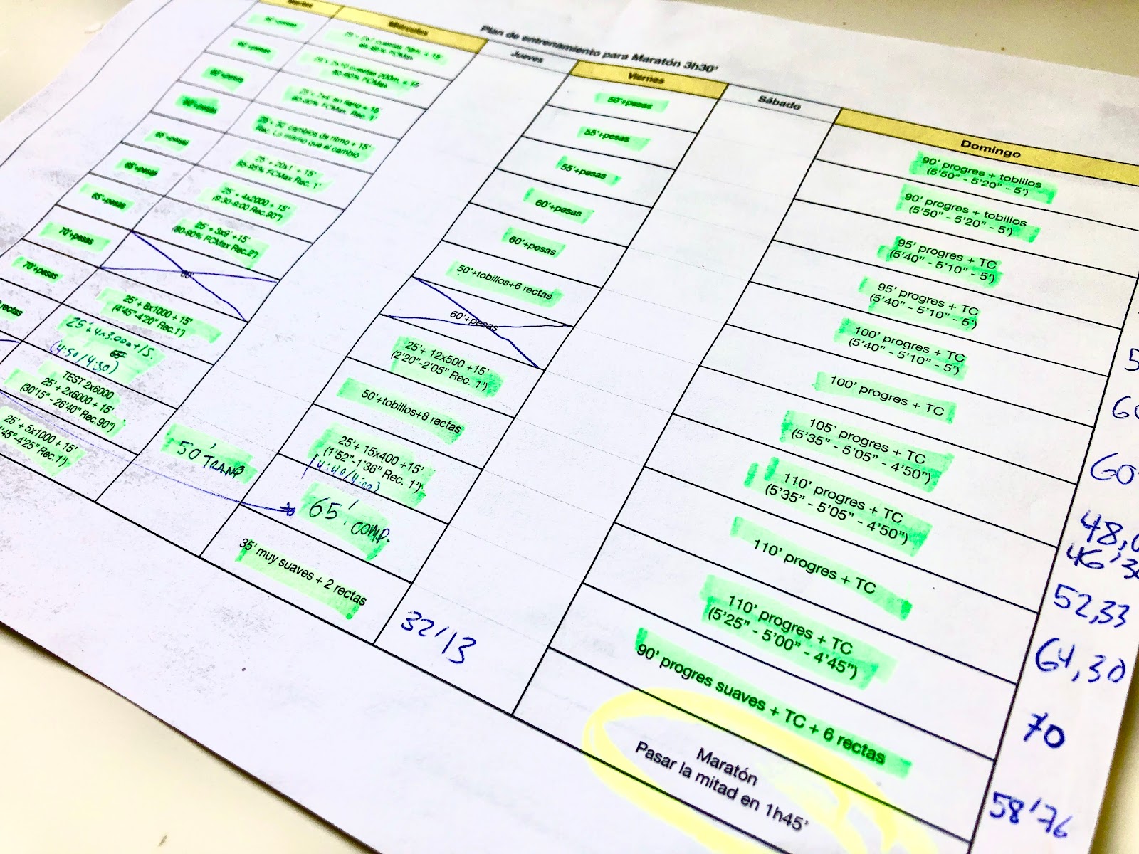 Total, que empecé mi plan de 12 semanas con un poco de temblequera en las piernas. Cualquiera que haya entrenado para un maratón sabe que lo duras que son esas semanas interminables así que es normal estar nervioso. Cuestas, series, tiradas, más series, más tiradas... Y cada día era una marca más en el calendario. Una más, una menos. Eso me decía cada semana.
